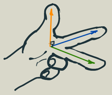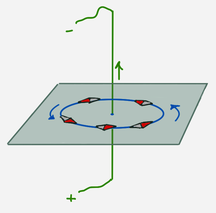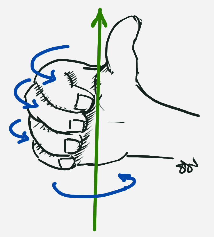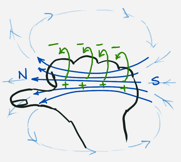 The right hand can be used to determine the magnetic field about the wire. The thumb points in direction of the conventional current + –> -.